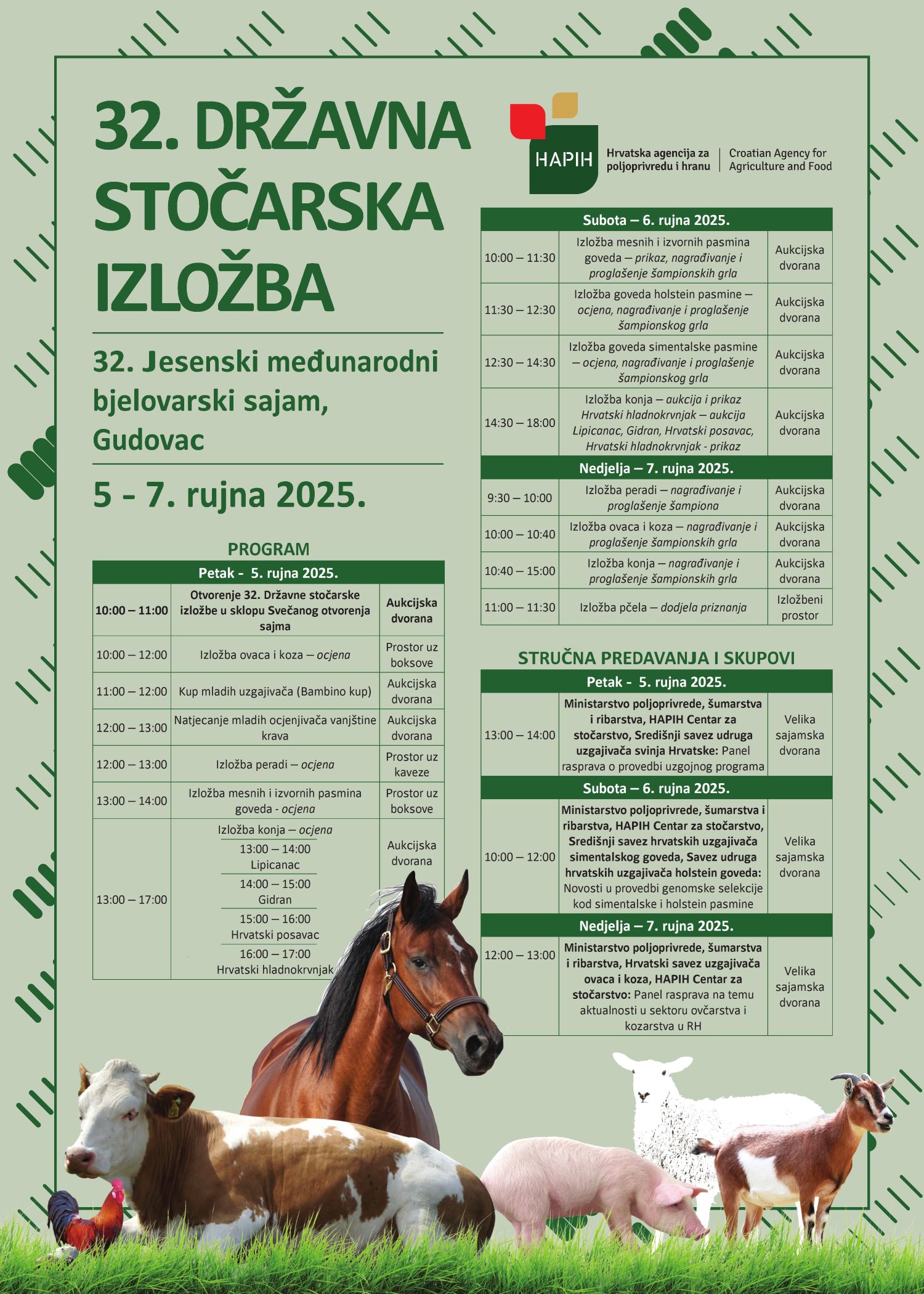 32. Državna stočarska izložba bit će održana 5.-7. rujna 2025. godine u sklopu Jesenskog međunarodnog bjelovarskog sajma u Gudovcu, uz pokroviteljstvo Ministarstva poljoprivrede, šumarstva i ribarstva te u organizaciji Bjelovarskog Sajma d.o.o., HAPIH-ovog Centra za stočarstvo i uzgojnih udruženja. Tijekom tri dana sajma uzgajivači će predstaviti svoja najbolja grla/kljunove (goveda, konji, magarci, ovce, koze, perad i pčele), dok svinja neće biti niti ove godine zbog prevencije ponovnog širenja afričke svinjske kuge.