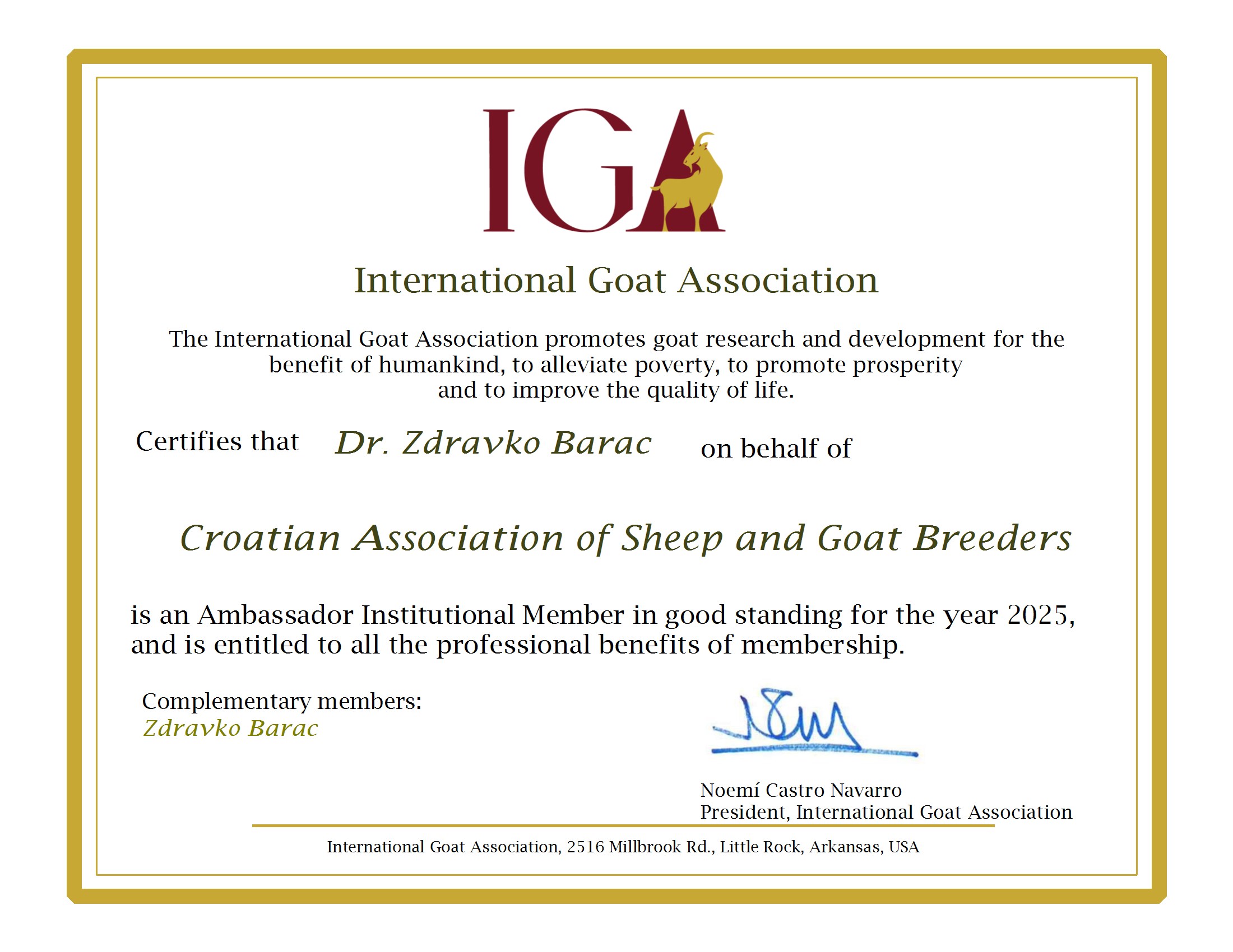 Hrvatski savez uzgajivača ovaca i koza je član Međunarodne asocijacije za uzgoj koza (IGA – International Goat Association www.iga-goatworld.com). IGA je globalna mreža ljudi i organizacija koja povezuje istraživanje i proizvodnju dijeleći informacije, iskustva i najbolje prakse. IGA se zalaže za socijalno pravednu, ekološki i ekonomski održivu kozarsku proizvodnju.